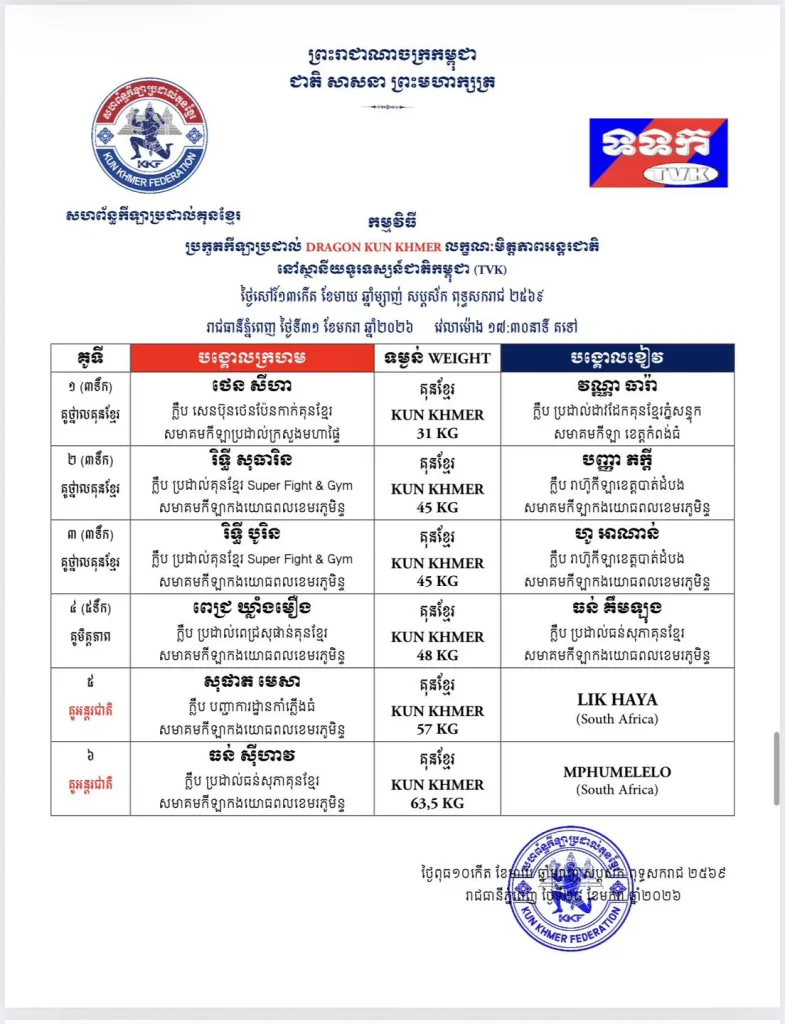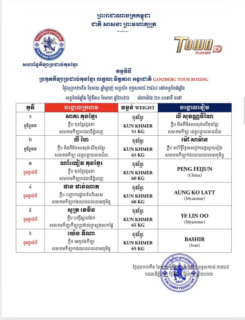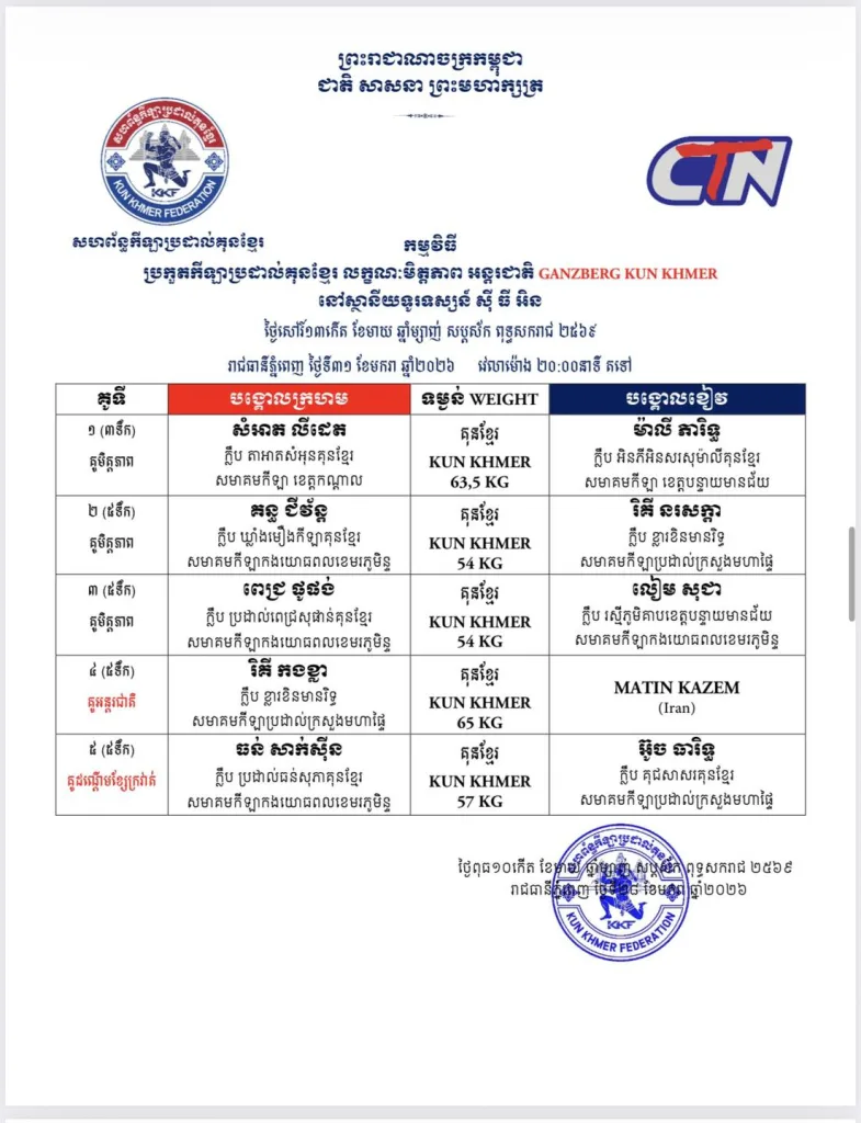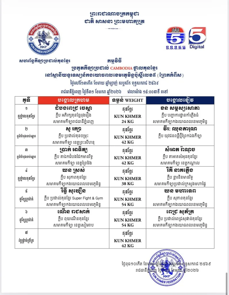From January 30β31 to February 1, 2026, Kun Khmer fans will witness an intense series of international and national friendly bouts, combined with official championship belt fights broadcast across multiple Cambodian TV stations πΊπ₯.