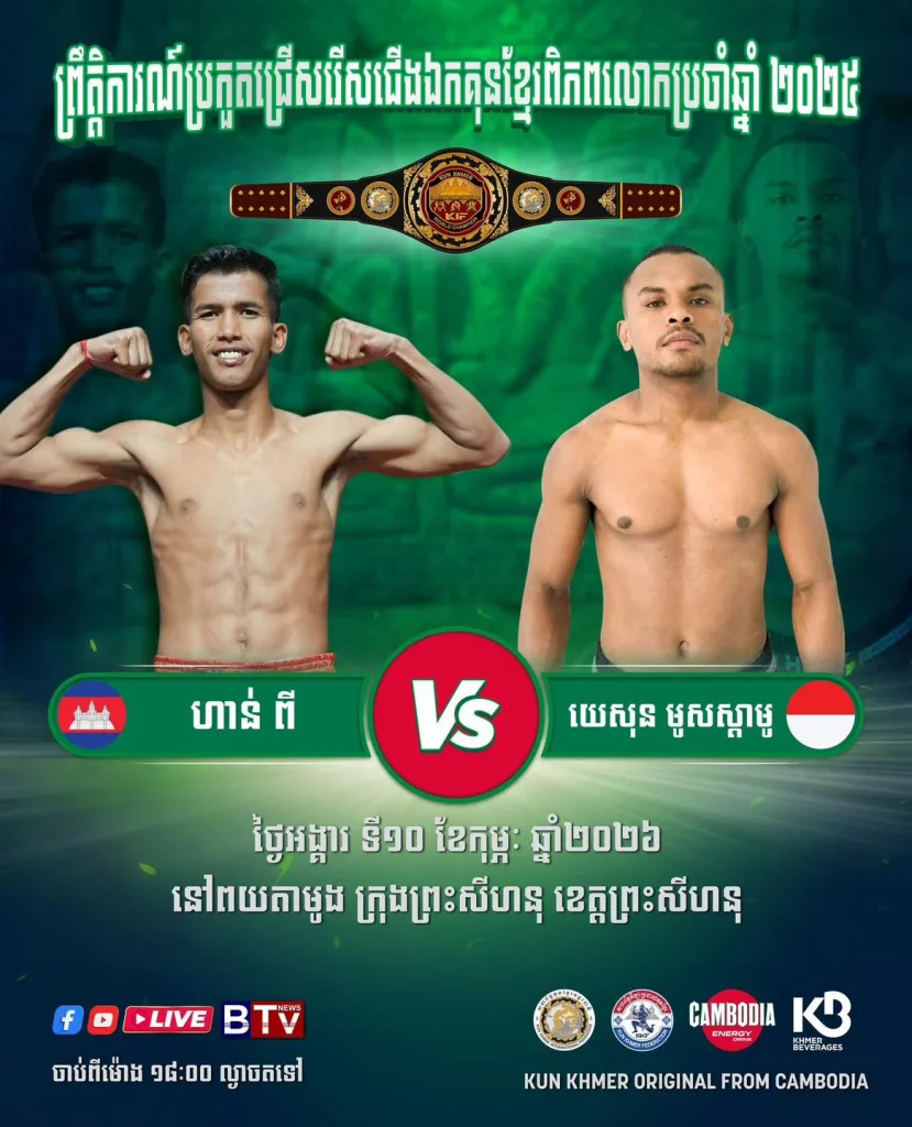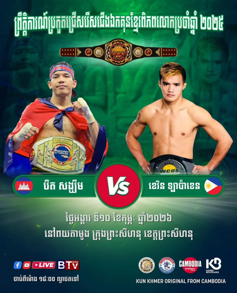 This page is your user-friendly guide to the 6th World Kun Khmer Championship (2026): the main fight card, belt bouts, dates, venue info, where to watch live, and quick tips for fans traveling to Sihanoukville. π₯π₯